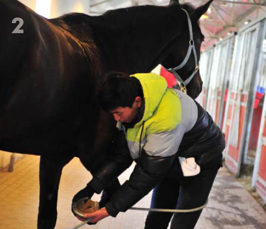 如图1、2 所示,在搬马前蹄的时候,站到马匹肩部旁边的位置,把手轻轻地放到它肩部隆起的位置上,手慢慢向下,朝着马蹄的方向抚摸,在这个过程中,保持手始终接触马的身体。你也许会发现,当手快要接近马蹄的时候,它自然而然地就把蹄子抬了起来;但也会发生相反的情况,马会向前迈步,它这样是在企图摆脱你。