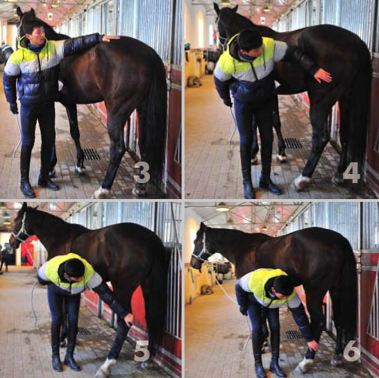 如图4、5、6 所示,手慢慢向下,朝着马后蹄的方向抚摸。年轻的小马可能会很快地从你手中抽回腿或蹄子,如果遇到这种情况,不要试图强硬地抓住它的腿或蹄子,应该让它自然地把马蹄放回到地上,鼓励它,并让它再尝试一次。