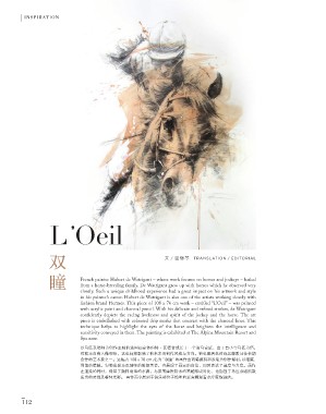 以马匹及骑师为创作主轴的法国画家休伯特瓦德甘成长于一个育马家庭,由于自小与马匹为伍,