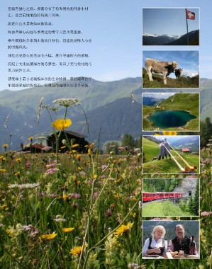 在踏青健行之际,探索分布于恰岑境内的纯朴小村 庄,品尝最地道的传统瑞士风味。 流连在山水景物如画的琉森。 拜访曾举办两届冬季奥运的滑雪天堂圣莫里兹。 乘坐横越阿尔卑斯山的冰川特快,沿途欣赏醉人心弦 的明媚风光。 前往历史悠久的圣加仑古镇,展开寻幽探古的旅程。 沉浸于文化底蕴深厚的苏黎世,见识于无与伦比的巧 克力制作艺术。 感受瑞士最古老城镇库尔的生命脉搏,悠然骑着自行 车缓缓穿越缤纷花田,向眼前的巍峨山峦道个问候。