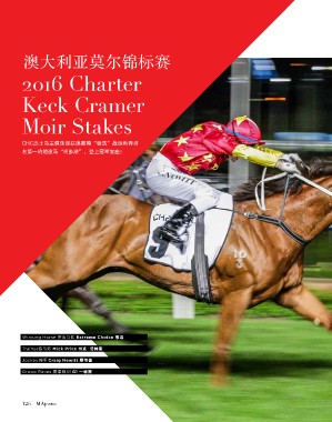 澳大利亚莫尔锦标赛 2016 Charter Keck Cramer Moir Stakes CHC杰士马主俱乐部驻澳赛驹“极选”战胜世界排 名第一的短途马“尚多湖”,登上冠军宝座! Winning Horse 胜出马匹 Extreme Choice 极选 Trainer练马师 Mick Price 米克·普林斯 Jockey骑师 Craig Newitt 廖伟德 Group Races 赛事级别 G1 一级赛 126 MAjestic