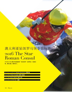 澳大利亚星级罗马领事锦标赛 2016 The Star Roman Consul CHC杰士马主俱乐部短跑健将“俄国先锋”击败两匹一级赛冠 军,技惊四座,傲然封王。 Winning Horse胜出马匹 Russian Revolution 俄国先锋 Trainer练马师 Peter Snowden 彼得·斯诺登 Jockey骑师 Kerrin McEvoy 麦克·沃伊 Group Races赛事级别 G1 一级赛 128 MAjestic