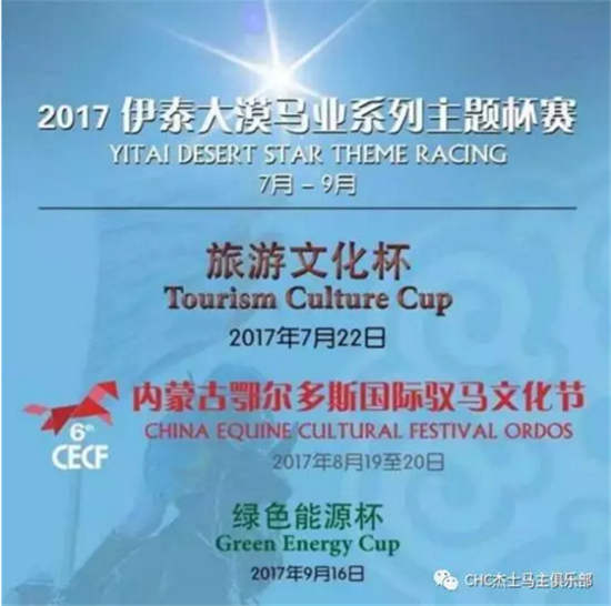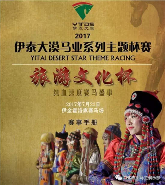 本次“旅游文化杯”是伊泰大漠“三杯一节”品牌赛事的第二站,2017年,伊泰大漠马业旗下赛事将由纯血速度赛马系列主题杯赛和CECF国际驭马文化节组成——6月24日、7月22日和9月16日分别举办“鄂尔多斯金杯”、“旅游文化杯”和“绿色能源杯”,8月20举办目前国内唯一获得国际赛马联合会(IFHA)官方认证,集高水平、高奖金、高市场化运作的无博彩性商业赛事——CECF国际驭马文化节,比赛地点为鄂尔多斯伊金霍洛旗赛马场