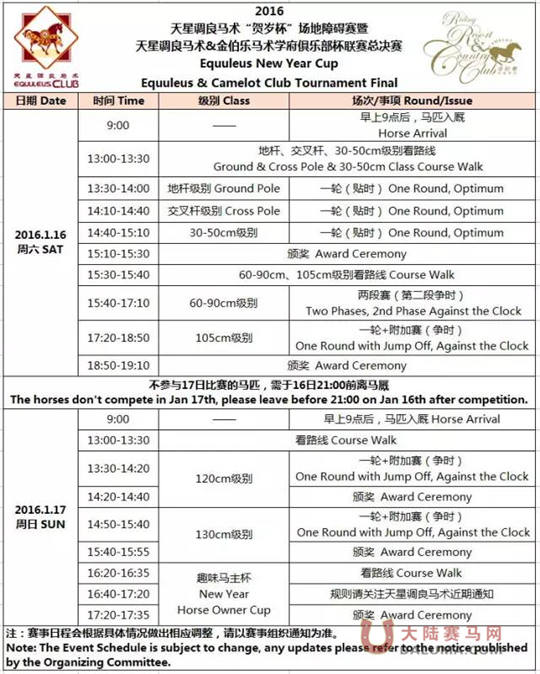 天星调良马术“贺岁杯”场地障碍赛暨天星调良马术&金伯乐马术学府俱乐部杯联赛总决赛赛事日程