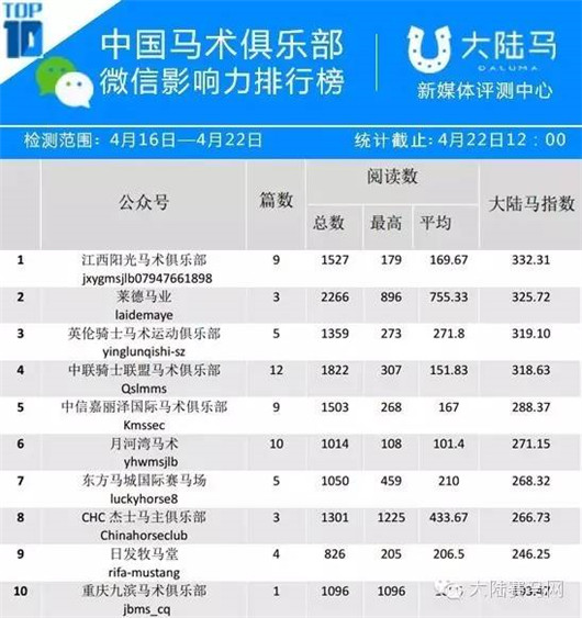 每期榜单由大陆马新媒体数据评测中心编制,依据各俱乐部微信数据、大陆赛马网PC端网站、大陆马APP、大陆赛马网微信、微博、搜索引擎(百度&谷歌)的搜索指数等客观数据以及产生的社会影响力、知名度综合评判,推出《中国马术俱乐部微信影响力排行榜》及《微信单篇阅读量最高文章》排名的榜单。力求助力马术俱乐部经营者们在“互联网+体育”的潮流下共同为俱乐部的业务提升探索新方向。