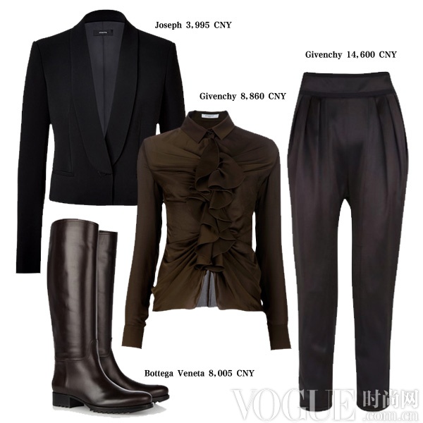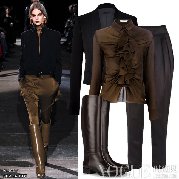 马裤长靴加上小外套,经典骑士风之外,最应潮流的就是小外套的短版版式。此外,衬衫的褶皱装饰,为整体比较硬朗的造型融入了女性的柔媚元素。