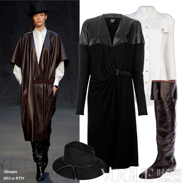 骑士风并不拘泥,尝试用宽松的拼皮开身裙与褶皱长靴搭配,并用帽子和有细节的衬衫作为点睛,同样能呈现出骑士风的意味。