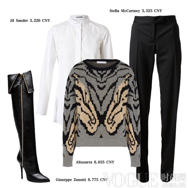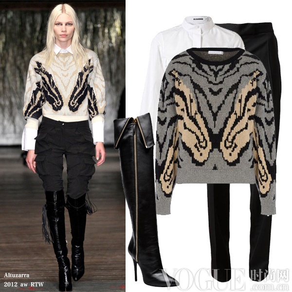 同样是马裤加长靴,与马头图样的针织衫搭配,虽然与传统意义的骑马装不同,但更富个性。此外,过膝长靴也是造型中的要点。