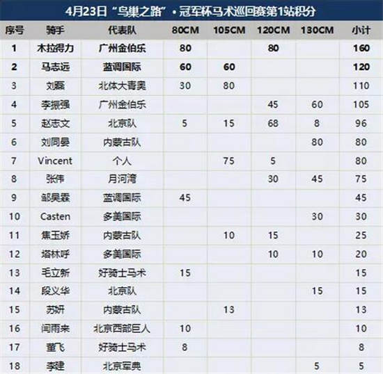 ▷4月23日“鸟巢之路”· 冠军杯马术巡回赛积分表