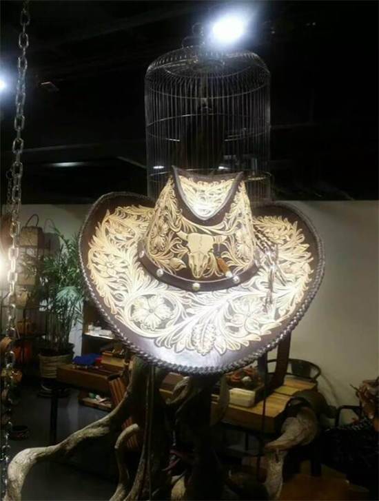 2、帅气的骑手装备--牛头骨唐草花满雕牛仔帽,展会期间还会推出牛仔坎肩、牛仔靴、西部大恰等全手作雕花作品,敬请期待。