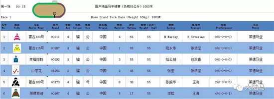 第一场:14:15 国产纯血马平磅赛(负榜55公斤)1000米