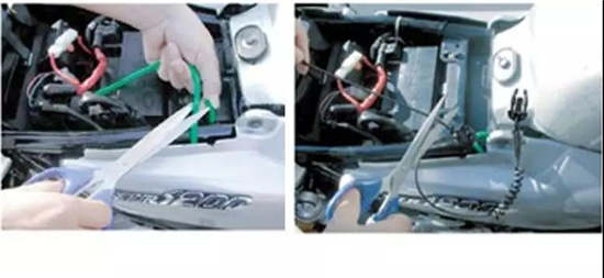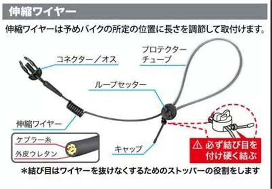 hit-air的其他系列的标配连接绳如下图所示,需要将安全绳穿过保护管,调节长度后剪去多余部分,最后扣上蝴蝶扣固定。这一稍显复杂的连接绳其实是为可以固定在摩托车坐垫下方而设计的。