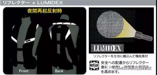 与此形成鲜明对比的是“MLV”款,由于这是一款专门为摩托车运动开发的产品,考虑到夜间行车的安全性,这款产品在前后都植入了反光材质。