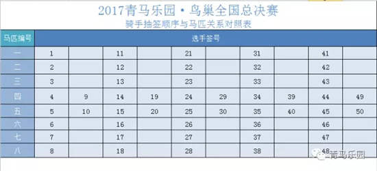 2017青马乐园·鸟巢全国总决赛比赛用马为Pony B型调教成熟马匹,由合作伙伴燕龙马业集团和骑域国际青少年骑士院提供。比赛用马共8匹,采取抽签形式,选手抽签顺序和马匹对应关系如下——