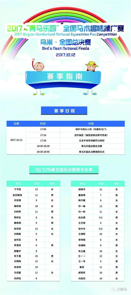 10月12日,2017青马乐园全国马术趣味推广赛·全国总决赛将在国际体育场(鸟巢)内场隆重举行!本次赛事将由优酷体育、乐视体育、大陆赛马网全程视频直播,期待小骑手们在全国观众面前一展风采!