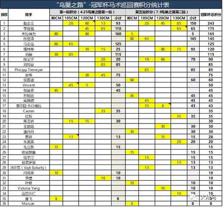 4月23日/7月9日“鸟巢之路”· 冠军杯马术巡回赛积分表