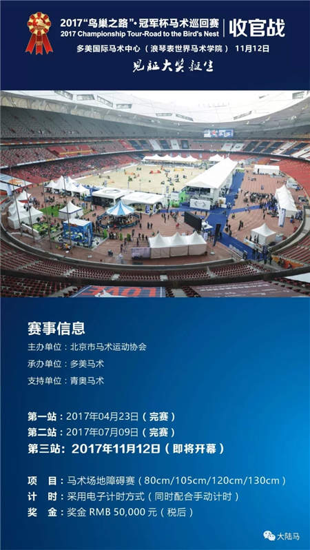 2017“鸟巢之路”•冠军杯马术巡回赛收官战于11月12日(星期日)在多美国际马术中心举行,七年多美、七重精彩,邀您共赏。