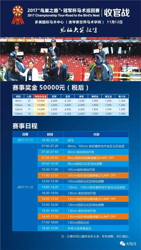 本年度“鸟巢之路”·冠军杯马术巡回赛4月+7月+11月三场赛事积分排名前十五位骑手,将赢取年终大奖。