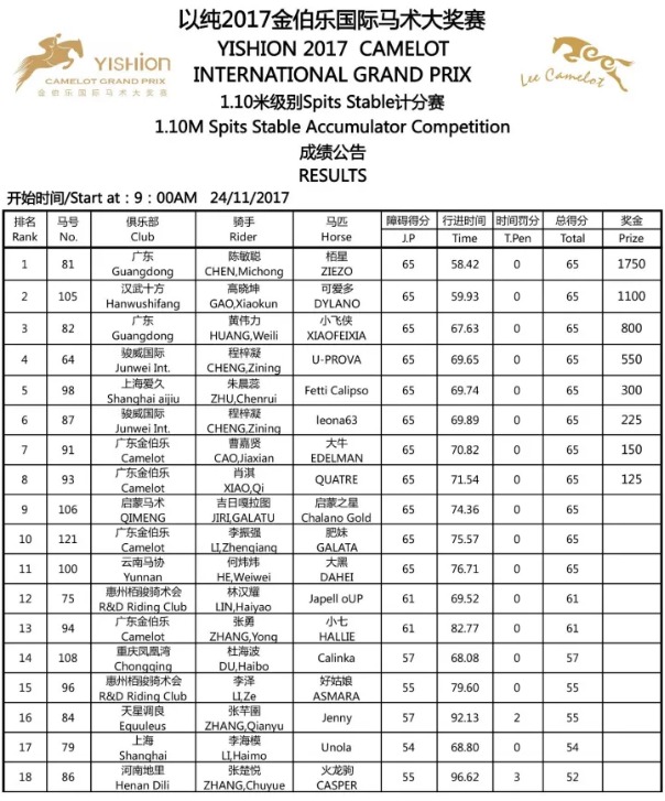 经过激烈的角逐,来自广东队的陈敏聪策骑马匹“栢星”获得冠军,来自汉武十方的高晓坤策骑马匹“可爱多”以一秒只差位列第二,同样来自广东队的黄伟力策骑马匹“小飞侠”获得季军。