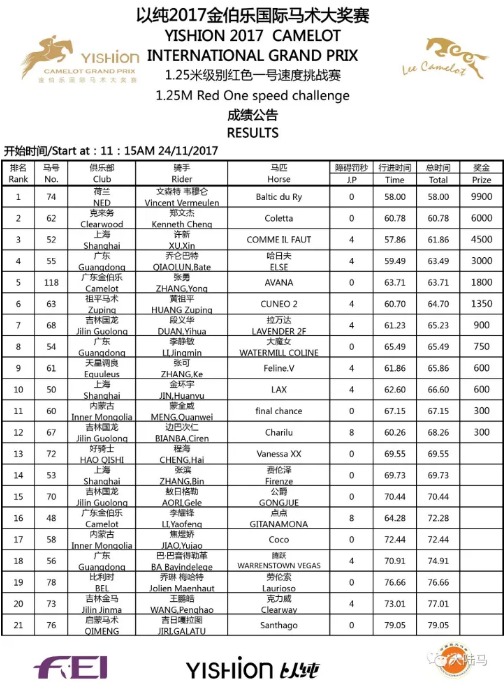 1.25米级别“红色一号”速度挑战赛于中午11:15正式开赛,共有30对人马组合参加, 这场速度与勇气的较量,骑手们都像参加Jump off一样,丝毫不敢松懈。来自荷兰的文森特Vincent Vermeulen 策骑马匹Baltiv du Ry以58秒0罚分的成绩获得冠军,郑文杰策骑马匹Coletta获得亚军,骑手许新搭档马匹COMME IL FAUT。