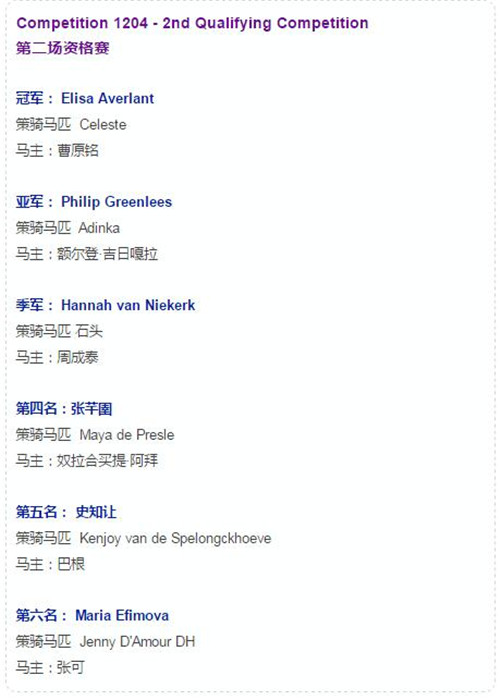 来自世界各地的20位12-14岁的年轻小骑手将参加本届总决赛,其中包括16名海外骑手和4名中国骑手。16名海外骑手中包括在今年10月份举办的金项巡回赛总决赛中表现最优的前10位选手以及6位来自每个FEI团体但还没有跻身进入前十的金项巡回赛选手。据了解,本届比赛的赛事包括第一轮资格赛、第二轮资格赛、团体赛以及总决赛等比赛。可见本届比赛是实力之间的较量,赛事必定精彩纷呈。