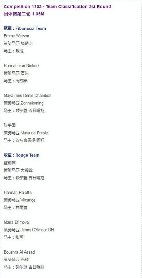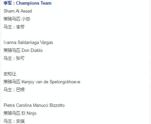 加拿大汉娜·拉杰特 (Hannah RAJOTT)、中国选手章锶檑、俄罗斯玛丽亚·艾菲莫娃(Maria EFIMOVA)和叙利亚骑手布莎·阿尔 - 阿萨德(Boushra AL-ASSAD)获得团体亚军;