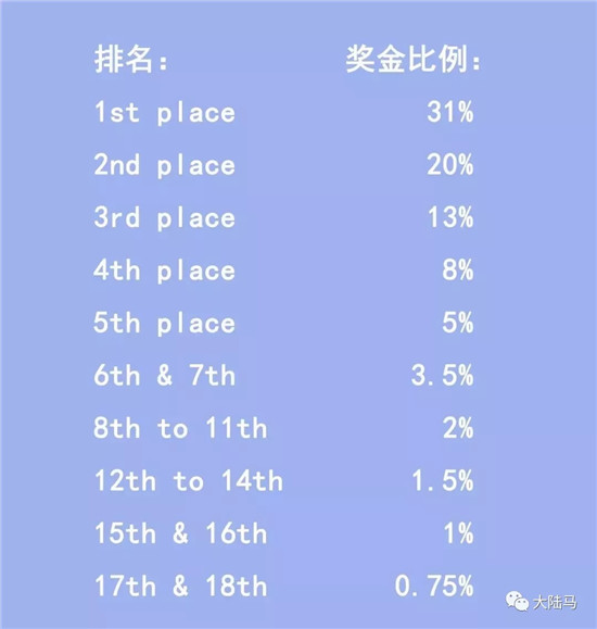 到了年末,积分最多的18名选手还能分走总金额为95万欧元(约736万人民币)的赛季末奖励。如果遇到平分就比谁冠军拿得更多,以此类推。