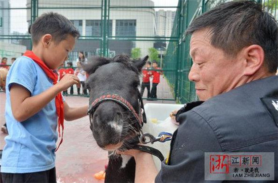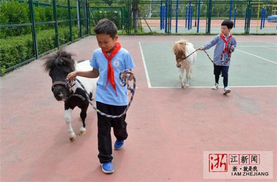 近日,杭州滨和小学引进了两匹纯英国进口的舍特蓝小马。这个品种的马很矮,黑白相间的是公的,高约65-70厘米;棕白相间的是母的,高约60厘米。看着就像两只大狗,虽然只有5岁,但对于马来说已经成年了。两匹小马来到学校后深受小学生喜爱,学生们通过“义卖”形式的社会实践活动为小马们筹集粮食。 校长说,等小马长大了,会考虑开设马术课,有兴趣的同学可以参加。