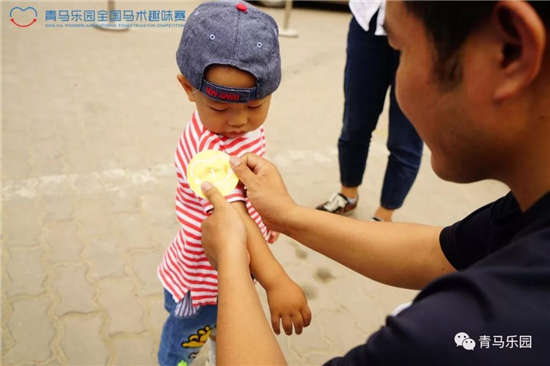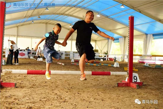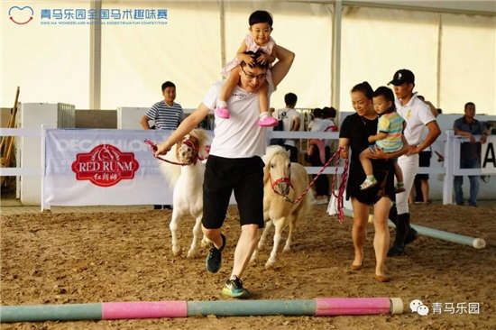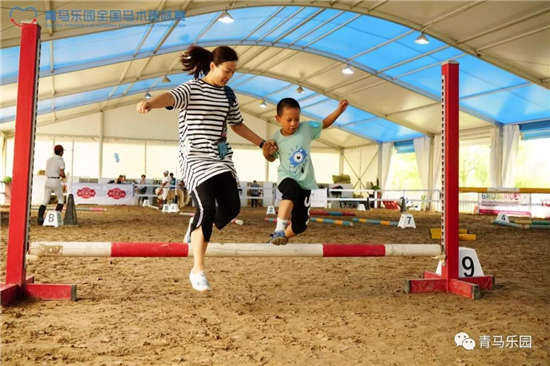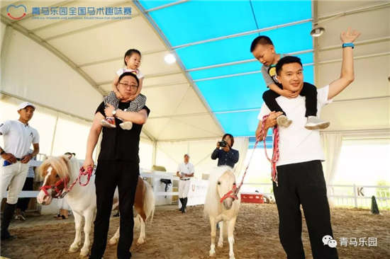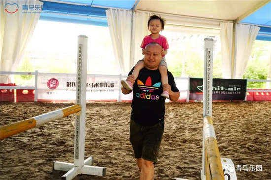 青马乐园最具特色、在全国被好评不断的项目之一便是——趣味亲子赛。比赛方式是家长和小朋友共同完成设置好的马术路线,但要求孩子的双脚必须离地,于是我们便看到了各显神通的父母:有的把孩子背在背上、有的还扛在肩上,甚至还有妈妈们为了和孩子享受亲子互动时刻,一点都不输“爸爸们”!