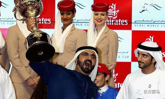 图/Time Out Dubai,迪拜酋长举起2014年迪拜世界杯奖杯