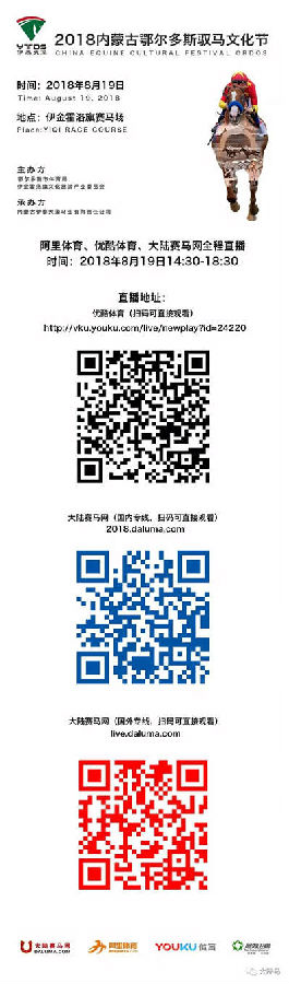 8月19日14:30-18:30,内蒙古鄂尔多斯驭马文化节将在天骄圣地——伊金霍洛旗赛马场举办,不仅各界赛马人士将会汇聚一堂,目前海南、湖北等相关政府部门机构都将特意前来组团观赛、考察鄂尔多斯赛马。大陆赛马网以及战略合作伙伴阿里体育、优酷体育都将面向海内外全程直播此次赛事,《旅游卫视》不仅冠名当天第二场1200米短途冲刺赛,更是派出超强阵容对赛事进行全方位报道,也是海南元素首次真正在赛马场的一次落地。