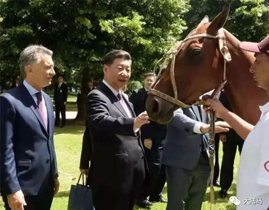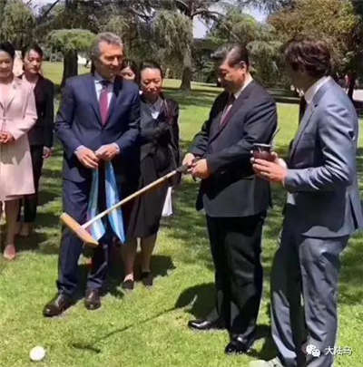 当地时间12月2日,国家主席习近平同阿根廷总统马克里在布宜诺斯艾利斯举行会谈。两国元首一致同意,以更加广阔视野谋划两国关系发展蓝图,携手开创中阿全面战略伙伴关系新时代。欢迎仪式结束后,习近平和马克里来到总统官邸办公楼外草坪,两国元首在交谈过程中,马克里向习近平介绍了马球运动,并赠送了一顶带有中国国旗图案的马球帽和一副马球球杆,习近平向马克里赠送中国刺绣作品《唐女马球图》。习近平手握球杆挥动击球,马克里微笑称赞。