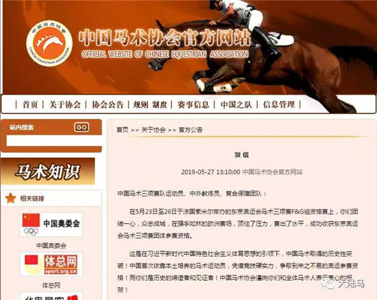 大陆赛马网讯 5月27日,中国马术协会官方网站发布对中国马术三项赛队获得2020年东京奥运会参赛资格的贺信,全文如下——