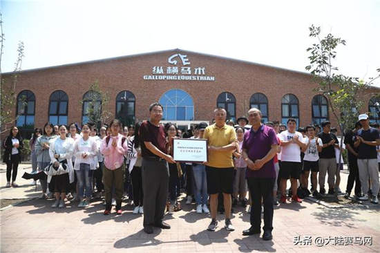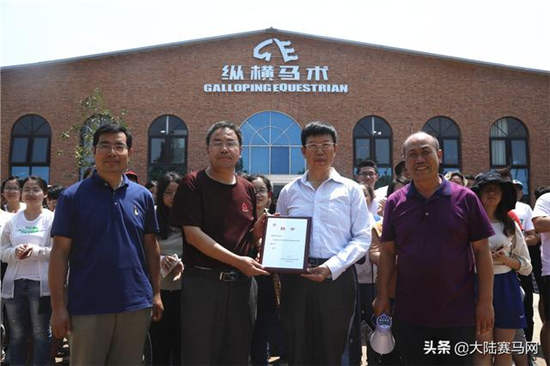 图:中国农业大学副教授、《动物科学专业认知实习》课程负责人王忠先生为纵横马术董事长贾增凯先生授牌,中国畜牧兽医学会马学分会理事长、中国马业协会副会长、中国农业大学动物科学技术专业教授韩国才现场见证