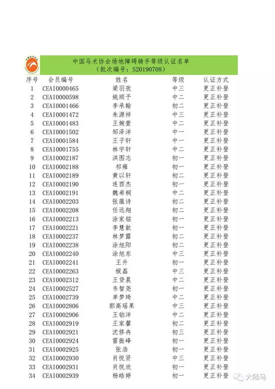 青马网(www.qingma.org)讯  7月10日,中国马术协会将20190708批次骑手等级认证名单进行了公示。本次认证名单包含20190315及20190705批次中进行姓名或会员编号更正或补充的情况,以及20190705批次遗漏或更正的骑手等级认证名单。公示时间自即日起至2019年7月15日。如对公示结果有异议,请书面反馈至中国马术协会。本批次认证名单公示无意见后,中国马术协会将授权运营商有序分批次发放骑手等级证书。其中梁羽孜、姚顺予等100名场地障碍骑手等级认证名单公示如下——