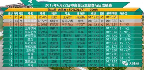6月22日,2019玉龙国际赛马公开赛第7赛事日——神奇百万主题赛马日于当天下午2:30准点开闸,58优骏在5场大赛中展开了激烈争夺,赛事总奖金31万元人民币。第三场未冠赛(50分及以下)1200米赛事,天赐圣泉马术俱乐部董事长王军宁旗下赛驹“浪遏飞舟”(父系:"道路"Strada)夺得冠军。