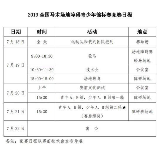 青马网(www.qingma.org)讯 7月20日-21日,全国青少年场地障碍锦标赛将在内蒙古自治区马术运动管理中心举办。报名时间自6月28日起至2019年7月12日下午16:00止。逾期报名,按不参加论。未完成中国马术协会2019年度会员及马匹注册手续,视为无效报名。竞赛日程见下图: