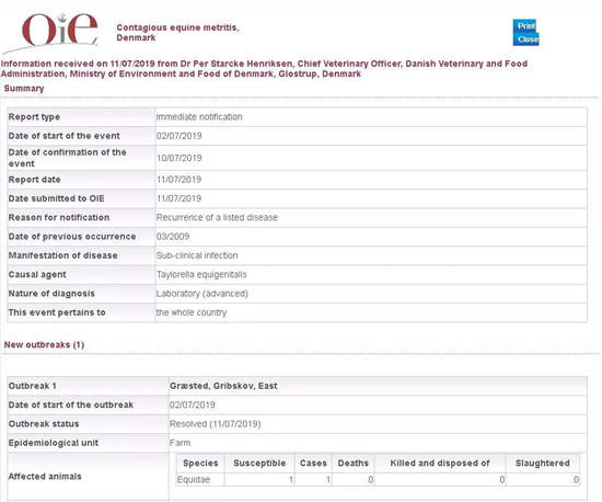 7月11日,丹麦官方向世界动物卫生组织(OIE)紧急通报,7月2日,东部地区(East)发生1起马接触传染性子宫炎,涉及的易感动物为1匹马,发病。