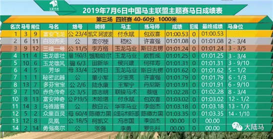 大陆赛马网讯 7月6日,2019玉龙国际赛马公开赛第9个比赛日——中国马主联盟主题赛马日在山西右玉玉龙国际赛马场举行。64匹赛驹在5场比赛中,向98万元人民币赛事奖金发起了冲击。第三场途程1000米的四班赛(40-60分)准时开闸,赛前备受关注的李勇旗下“勇强高尔”(父系:“范高尔”Frankel)因赛前感冒未愈赛前退赛,此外冯志国的“凤凰”赛前也临时退赛,最终12匹赛驹展开激烈角逐。最终,鄂尔多斯天富安马业付永斌旗下的“富安飞龙”(父系:“赛百灵”Sebring)在外籍骑师凯文·阿波波策骑下,以1:00:53率先冲线夺得冠军。