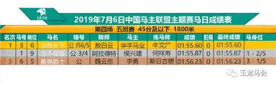 大陆赛马网讯 7月6日,2019玉龙国际赛马公开赛第9个比赛日——中国马主联盟主题赛马日在山西右玉玉龙国际赛马场举行。64匹赛驹在5场比赛中,向98万元人民币赛事奖金发起了冲击。第四场五班赛(45分及以下,途程1800米、奖金4万元)的比赛中,天津华宇马业派遣两驹出赛,最终“决胜天下”(父系:“尼亚加拉”Niagara)凭借后程强有力的冲刺夺得了冠军。
