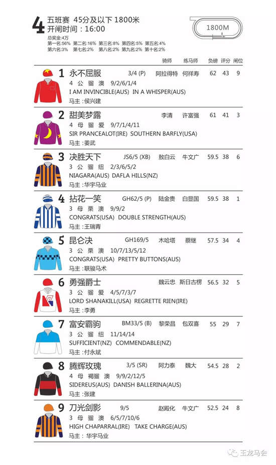 马主:天津华宇马业 骑师:敖白云 练马师:牛文广