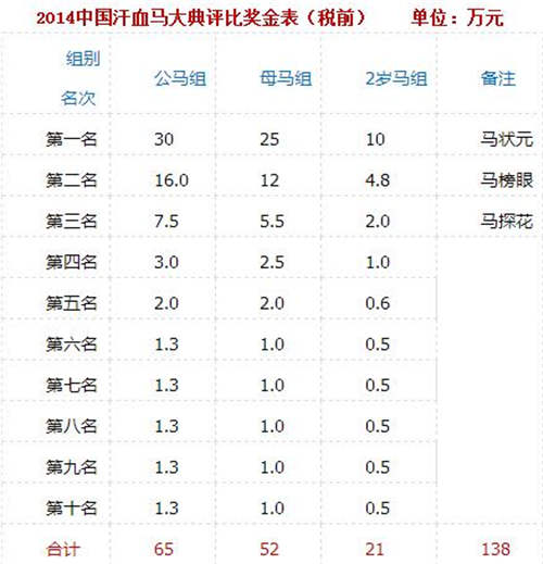 2014中国汗血马大典总奖金为138万元人民币,其中公马组为65万元,母马组为52万元,2岁马组为21万元。可谓奖金不菲,那么138万、52万和21万是如何制定出来的呢?