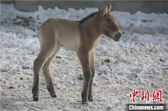 普氏野马是目前地球上唯一存活的野生马,保留着马的原始基因,曾栖息在从准噶尔盆地到蒙古高原西南部的荒漠草原地带,是比大熊猫还珍稀的濒危物种。2月1日,出生已3天的小马驹“冰雪公主”正在新疆野马繁殖研究中心场地里跟着妈妈撒欢。这两天,小马驹身体况越来越好,不时会模仿妈妈的样子,把草含在口中,做出咀嚼的动作。