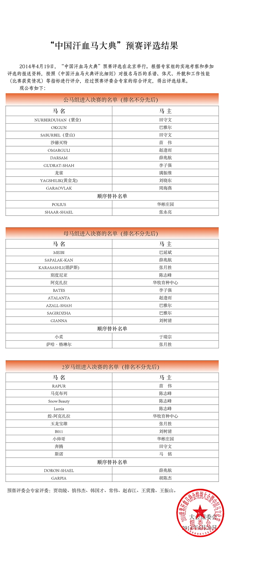 4月19日,“中国汗血马大典”预赛评选结果在北京揭晓。根据专家组的实地考察和参加评选的报送材料,按照《中国汗血马大典评比细则》对报名马匹的系谱、体尺、外貌和工作性能(比赛获奖情况)等指标进行评分,经过预赛评委会专家的综合评定,得出评选结果。预赛评选委员会专家评委有:贾幼陵、慎伟杰、韩国才、常伟、赵春江、王冀豫、王振山。