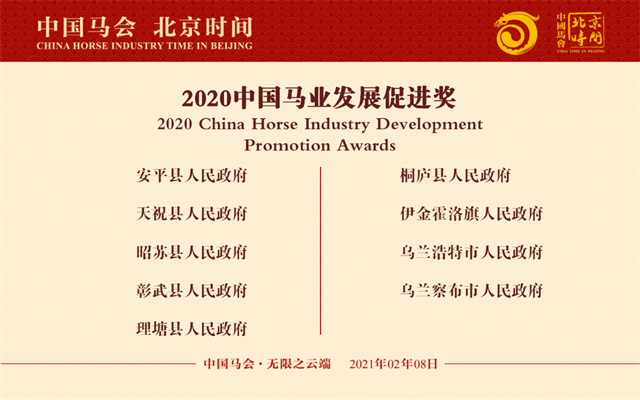大陆赛马网讯 2月8日上午,2021“中国马会·北京时间”以“云”会议的形式隆重举行。经过提名和选定,中国马会对在2020年为中国马业发展做出积极贡献的团体和个人进行了表彰。彰武县人民政府、乌兰察布市人民政府、理塘县人民政府、天祝县人民政府、桐庐县人民政府、昭苏县人民政府、安平县人民政府、伊金霍洛旗人民政府、乌兰浩特市人民政府获2020中国马业发展促进奖。