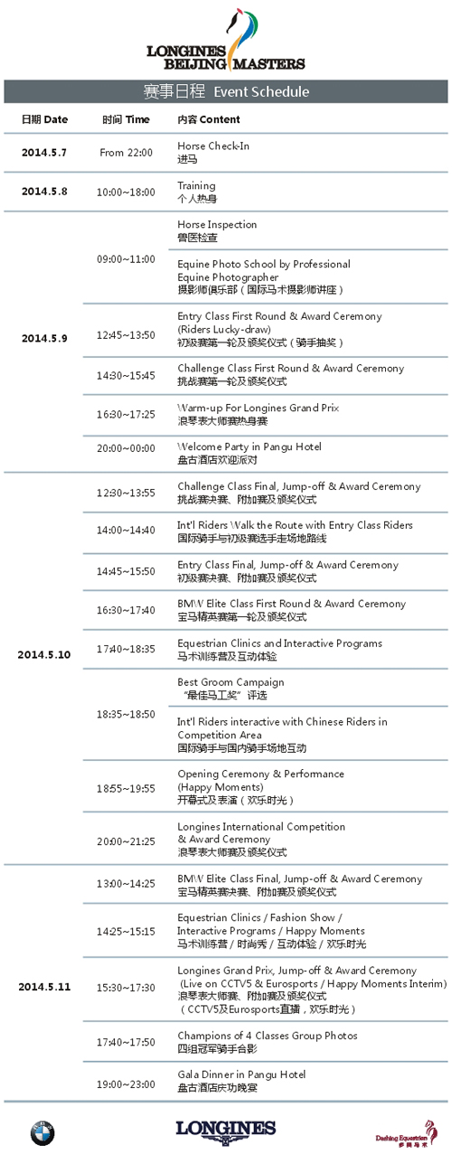 5月9日-11日,2014北京国际马术大师赛将在国家体育场——鸟巢举行。本届大赛共125名国内外一流骑手参赛、130余匹宝马良驹齐聚鸟巢!大赛采用国际高水平马术赛事标准的草地赛场,并设有独特的夜场马术障碍赛。这将是在中国首度举办的国际马联三星级(FEI CSI3)马术障碍赛,是目前为止中国马术障碍赛的最高级别。