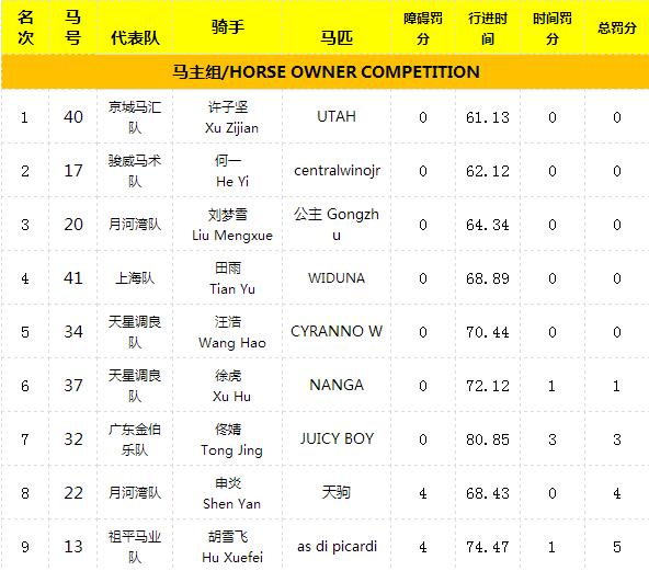 马术世界杯中国联赛  马主赛(60-90CM)两轮赛第一轮的成绩表: