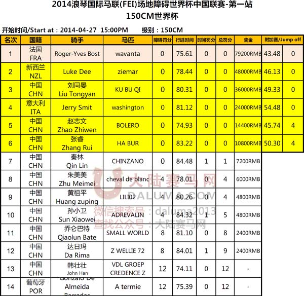 4月27日,2014国际马联(FEI)场地障碍世界杯中国联赛第一站的重头戏——世界杯赛(150CM)在朝阳公园马术场落下帷幕,比赛共有6位骑手进入加时赛。最终法国骑手特Roger-Yves Bost策骑马匹wavanta在附加赛(JUMP OFF)中以43秒48的最短时间完成零罚分,最终夺魁。来自新西兰的年轻骑手Luke Dee名列第二,中国骑手刘同晏名列第三。排名第四至八名的分别是:意大利骑手Jerry Smit,中国骑手赵志文、张睿、秦林和朱美美。