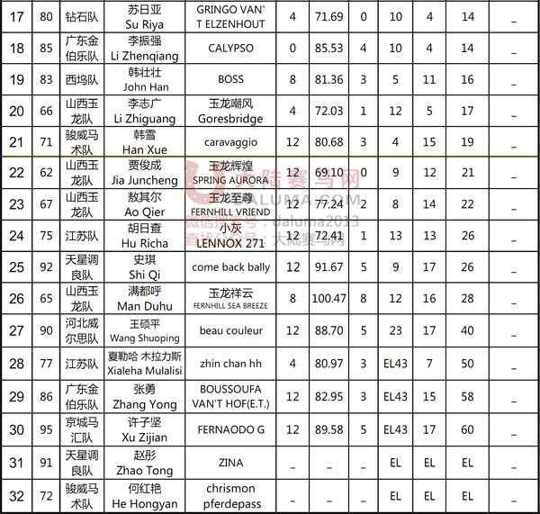 马术世界杯场地障碍中国联赛第一站110-120cm马主组全部骑手马匹成绩如下: