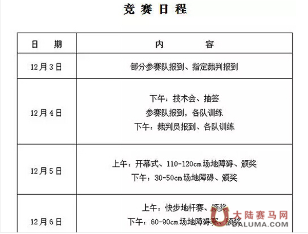 从今日,即12月3日起,各参赛代表队和指定裁判已陆续来到参赛地点报到。12月5日至6日,比赛将正式开始,项目包括地杆赛、场地障碍赛(30-50cm组、60-90cm组、110-120cm组)。